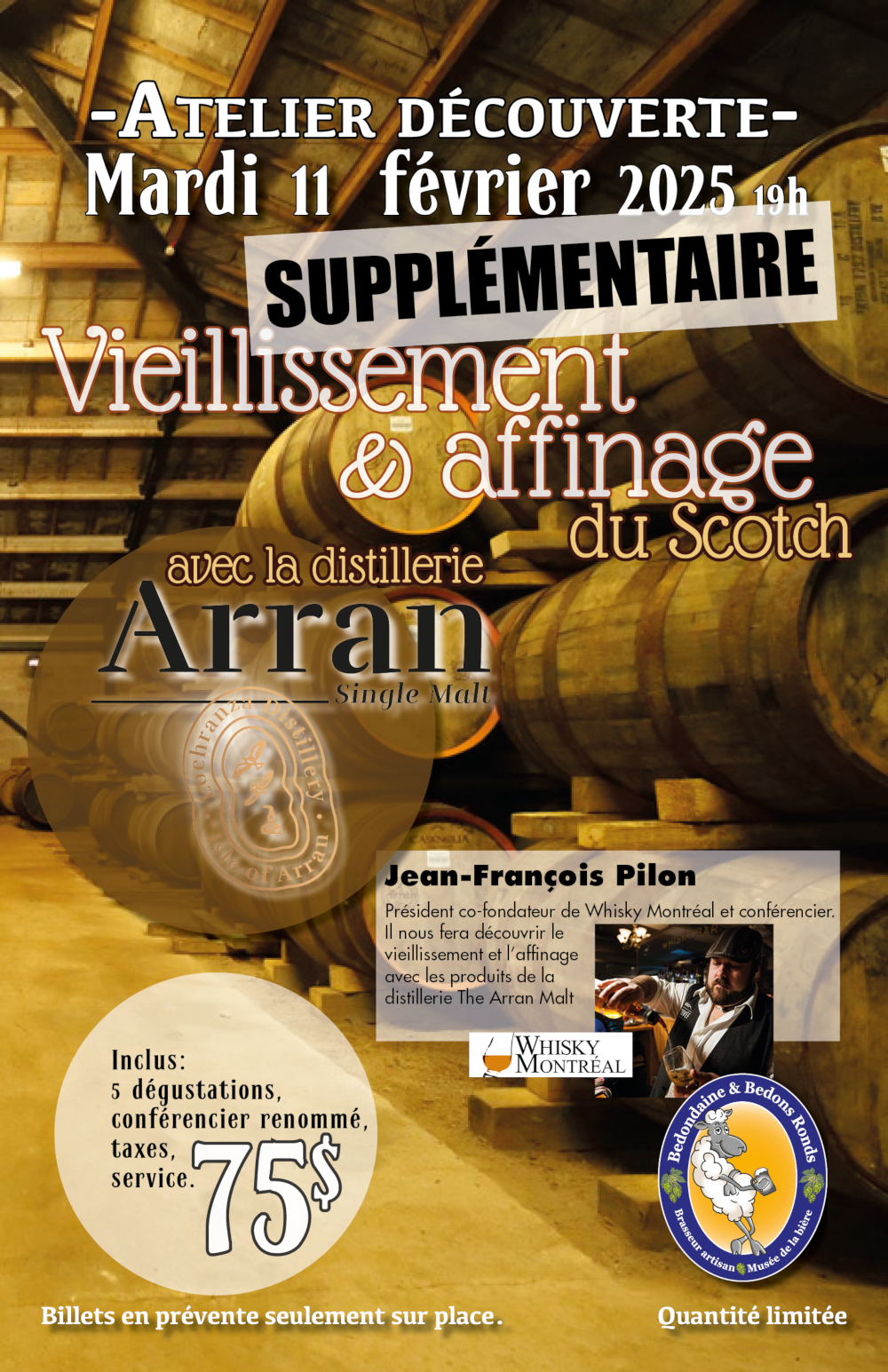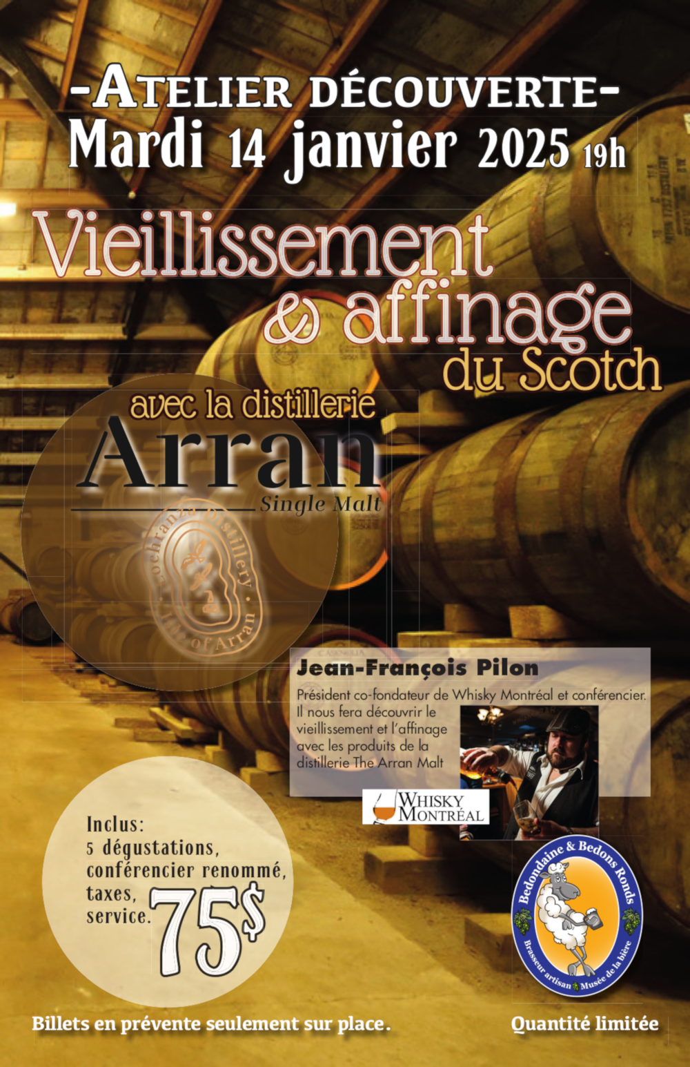 Supplémentaire!Atelier découverte – Mardi 11 février 2025, 19hVieillissement et affinage du scotchavec la distillerie Arran