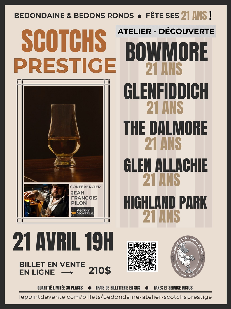 Une dégustation exceptionnelle pour le 21e anniversaire de Bedondaine & Bedons Ronds : cinq scotchs de 21 ans présentés par Jean-François Pilon (Whisky Montréal).