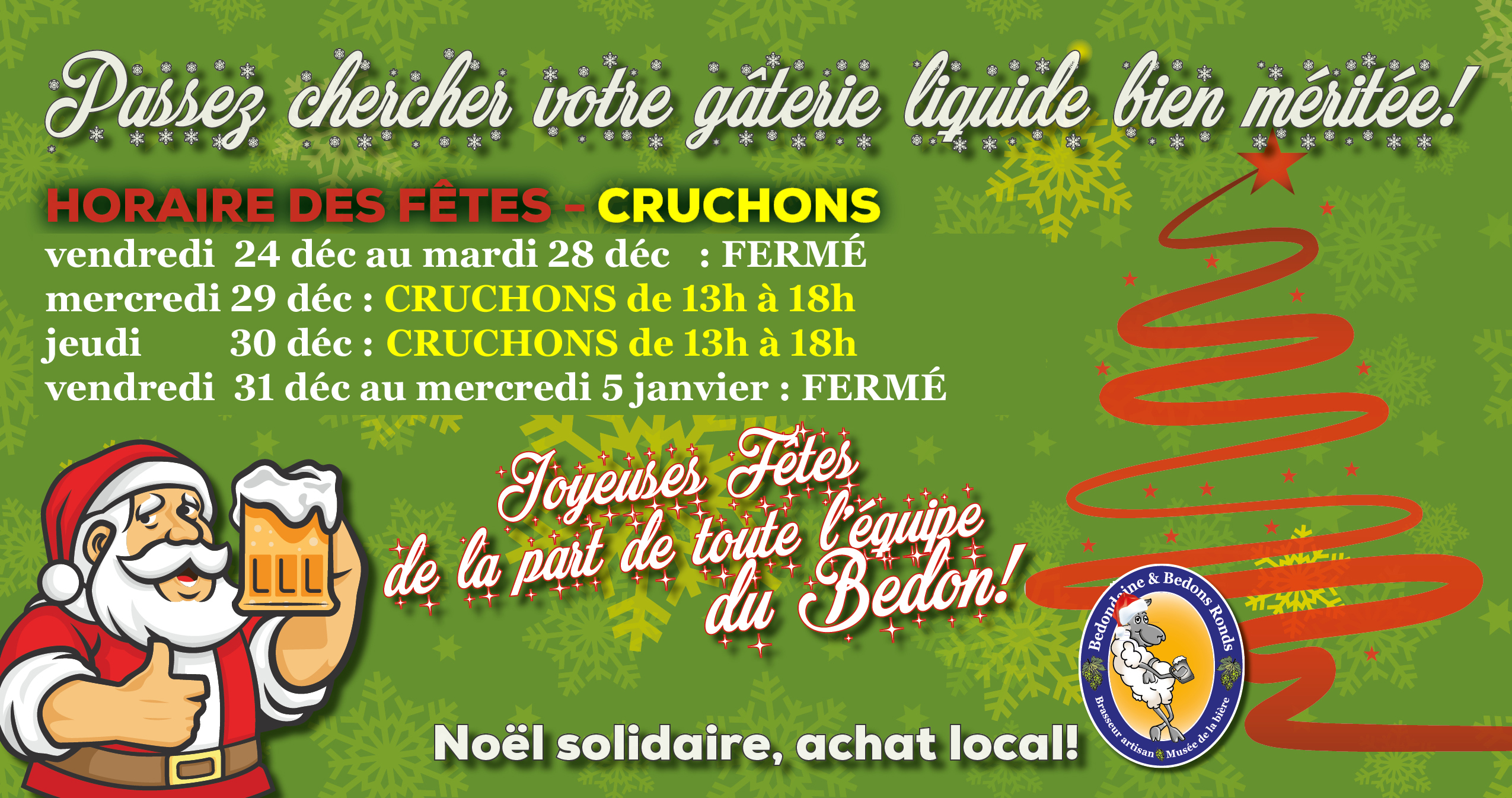 Nous sommes ouverts pour les commandes de cruchons le 29 et 30 décembre de 13h à 18h. De retour le 6 janvier. Joyeuses fêtes!